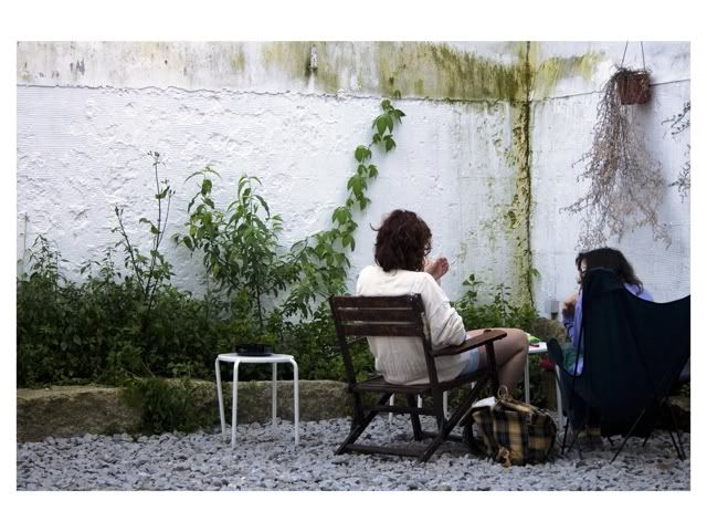 A textura da parede, a intimidade da conversa e do sorriso resguardado, o chão fractal, a trepadeira a subir um percurso oblíquo, o bolor na aresta,... nesta foto tudo fala e respira!Porra que eu já ando repetitivo mas isto está 5 estrelas!!!